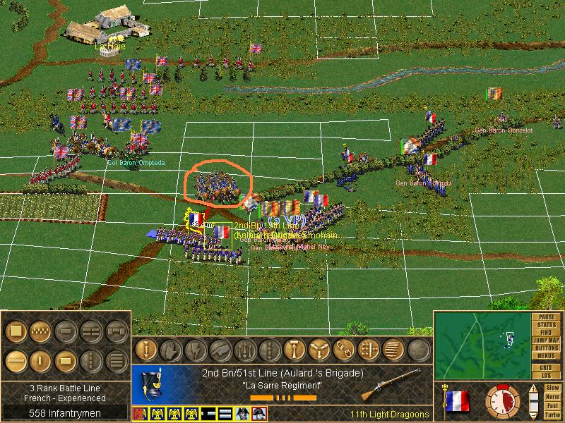 Blancard's cavalry succeeded in driving off the English cavalry from the south road, thus securing this location for Napoleon. However, the English had split up their cavalry - they had only sent parts of it down to the south road, while the rest of it charged the infantry defending the crossroads. The English cavalry were however under heavy fire from both Aulard's and Schmitz's infantry, as well as one of the artillery batteries, and though they forced one infantry battalion to fall back and regroup, the French line still held.